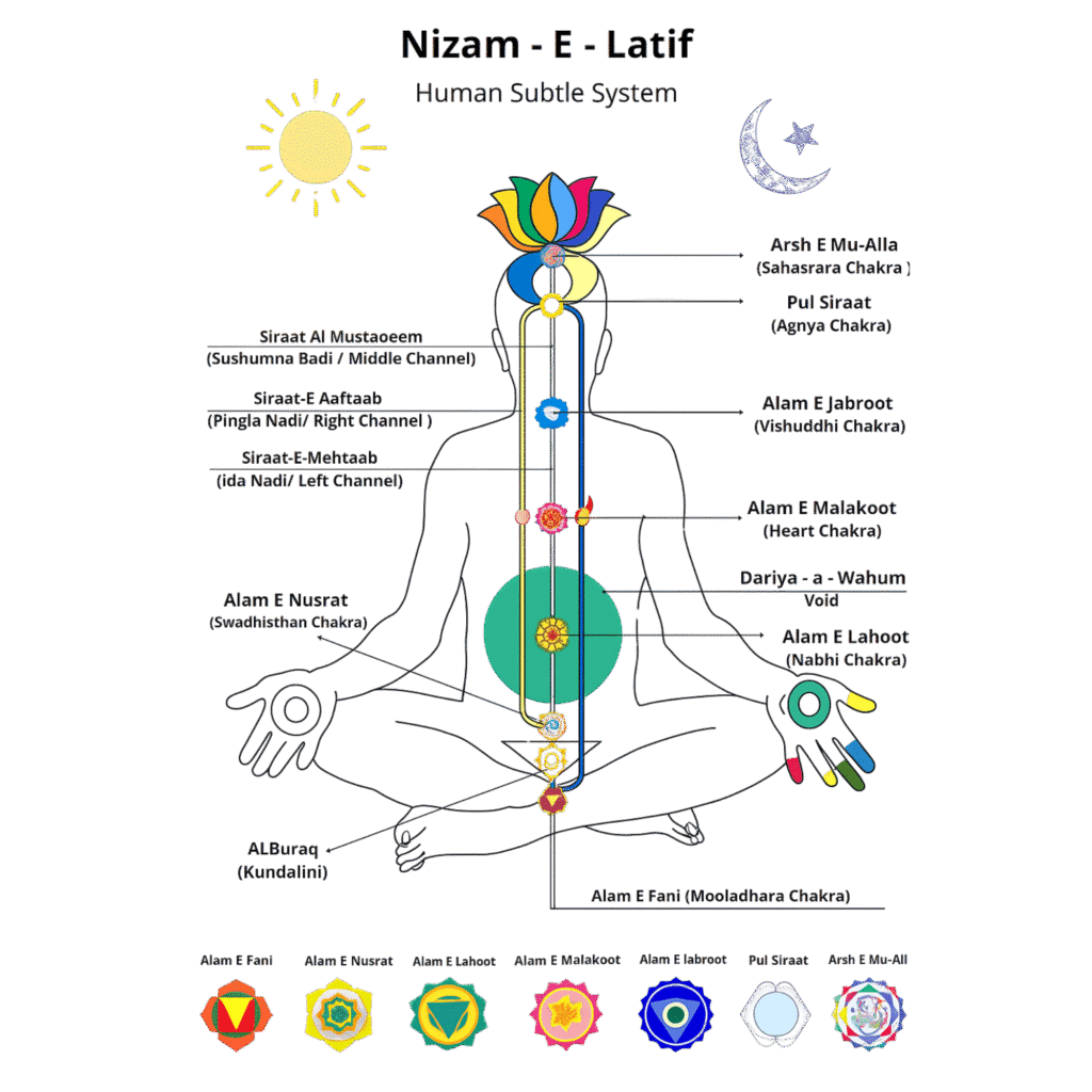 Experience the rising of a coiled, primal energy from the base of the spine through the body’s chakras (لطف – Lataif), activating each energy center, leading to self-realization, inner balance, and expanded consciousness. Learn to harness this energy for spiritual growth and holistic well-being.